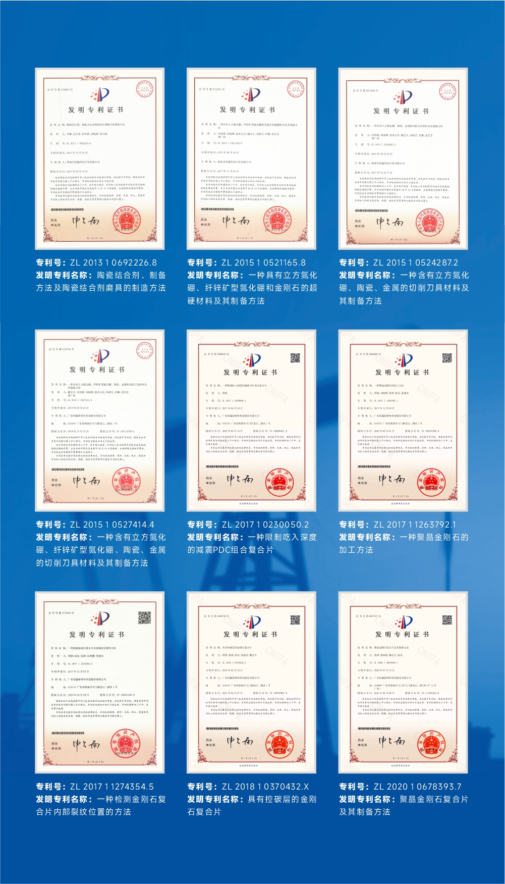 | 鉅鑫新材料在超硬材料及超硬材料制品領(lǐng)域積淀超過20年,積極吸納國際先進(jìn)技術(shù),大力投入科技研發(fā),多項(xiàng)成果得到專利授權(quán),形成自主知識產(chǎn)權(quán)的核心技術(shù),為實(shí)現(xiàn)更高水平的突破奠定了堅(jiān)實(shí)的基礎(chǔ)。 |