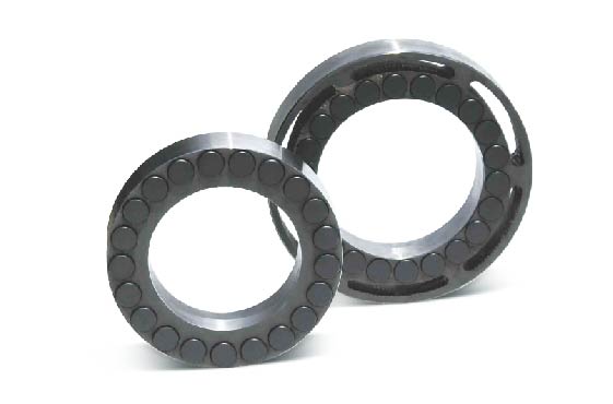 PDC軸承:適合于井下惡劣工況。試驗結(jié)果表明,在開式泥漿 潤滑冷卻條件下,最高比壓達32MN/m,轉(zhuǎn)速400rev/min, PV值高達30MN/m·m/s時,PDC止推軸承仍具有理想的磨擦系數(shù)和磨損壽命,可較好地應(yīng)用于井下動力鉆具中。廣泛用于石油、礦山等部門的井下動力鉆具
